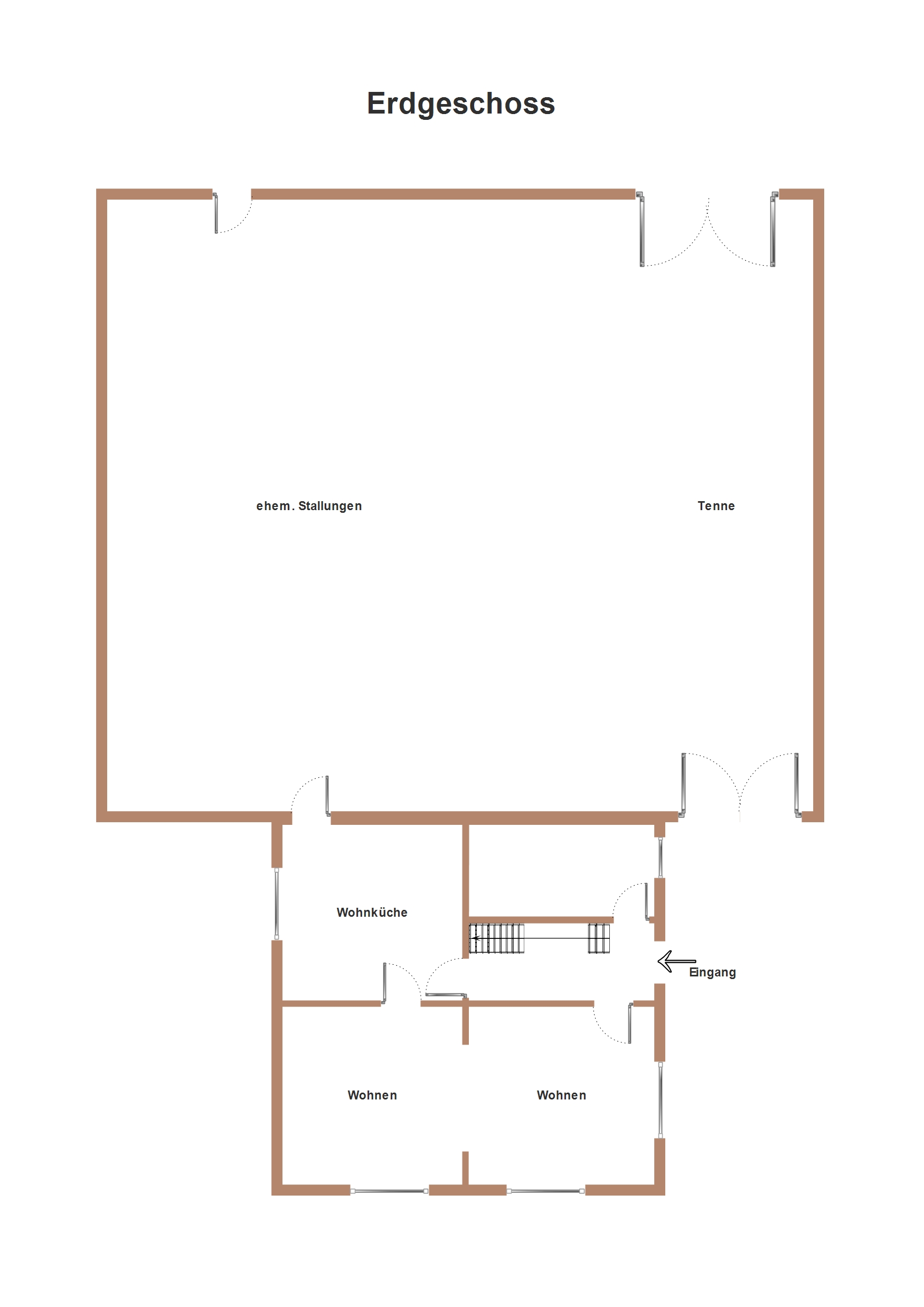 Der Wohnteil (Baujahr 1954) mit ca. 115 m² war bis in jüngster Zeit bewohnt, benötigt jedoch bauliche und energetische Modernisierungen um heutige Standards zu erreichen.