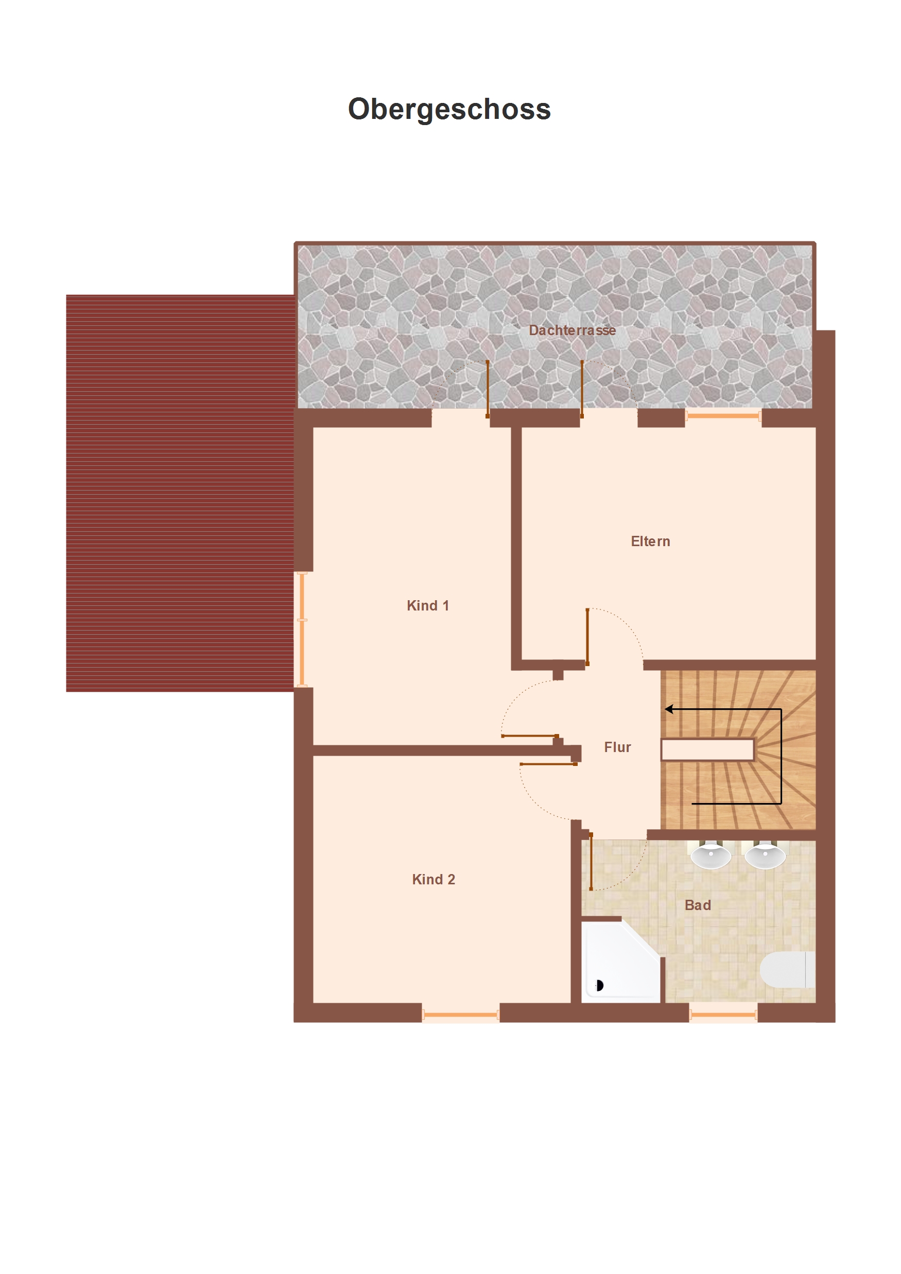 Dachgeschoss: 3 Schlafräume, große Dachterrasse, Bad/WC, Flur u. Dachboden