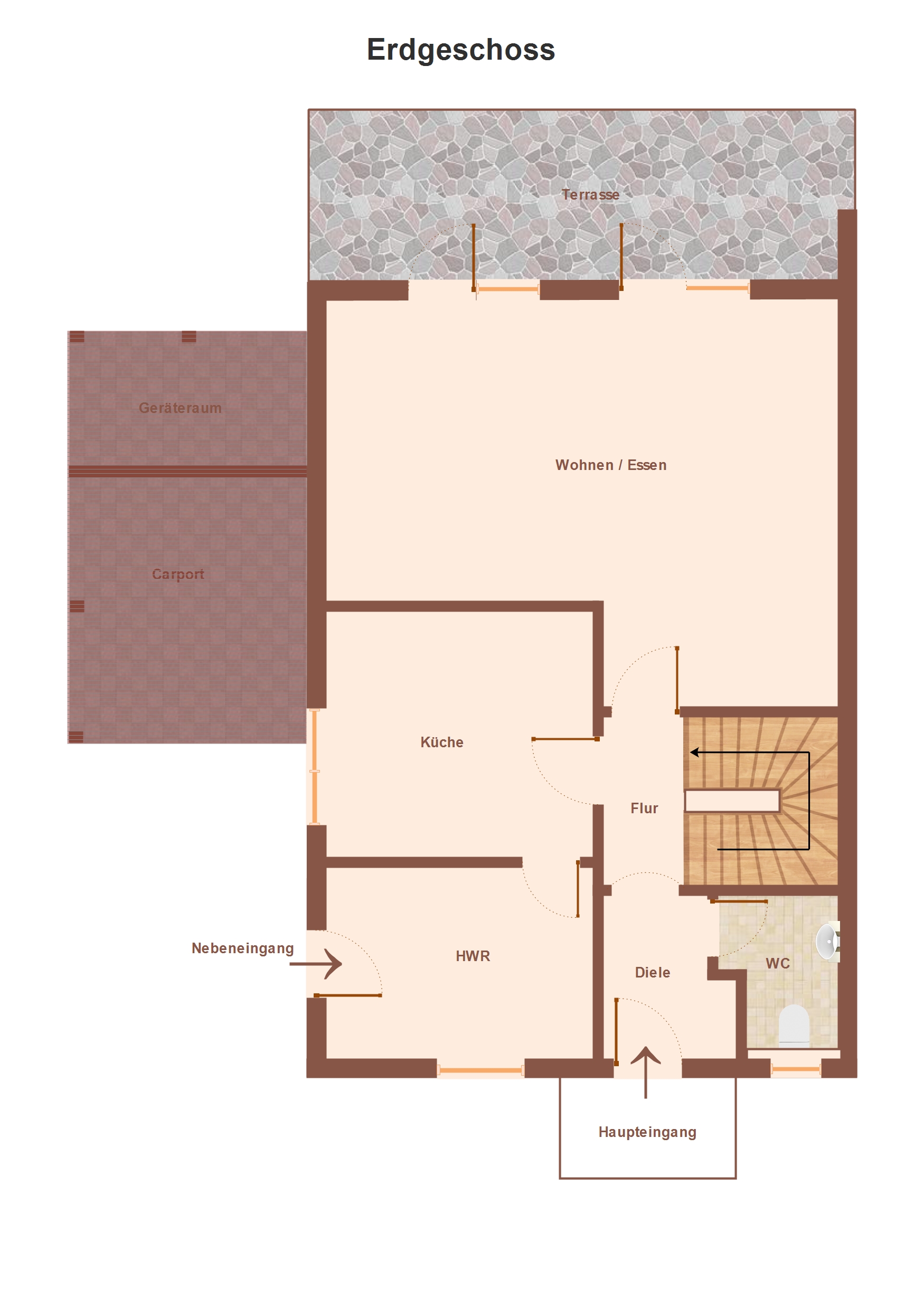 Erdgeschoss: Wohn- u. Esszimmer m. gr. Sonnenterrasse, Wohnküche, Diele, Gäste-WC
